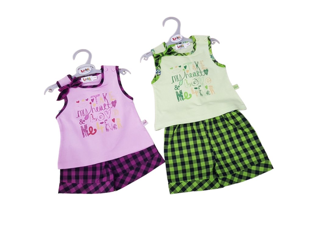 Detský komplet. Obsahuje: tielko s nápisom a kárované krátke nohavice.