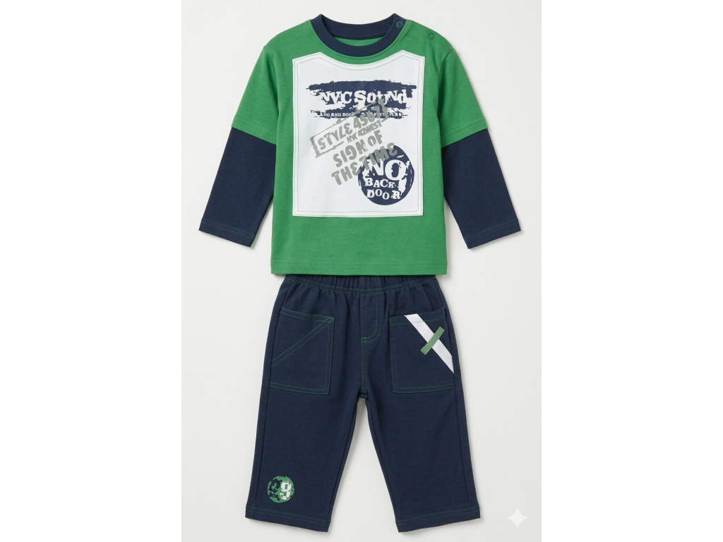 Tento moderný chlapčenský komplet je ideálnym riešením pre každodenné dobrodružstvá vášho syna. Súprava pozostáva zo štýlového trička s dlhým rukávom a pohodlných nohavíc, ktoré sú navrhnuté tak, aby dieťaťu dopriali maximálnu voľnosť pohybu počas hry na ihrisku, v škôlke alebo pri prechádzkach.