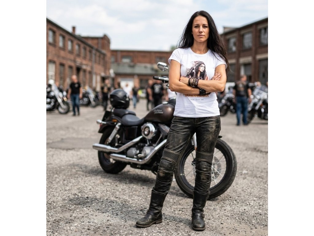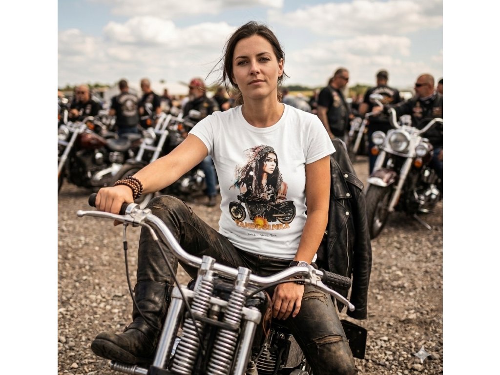 Vyjadrite svoju nespútanú dušu s týmto exkluzívnym dámskym motorkárskym tričkom. Dominantný motív indiánky s nápadnou čelenkou, ktorá hrdo pózuje pri klasickom motocykli, symbolizuje slobodu a silu, ktorú zažívate len na cestách. Toto tričko nie je len oblečenie, je to postoj.