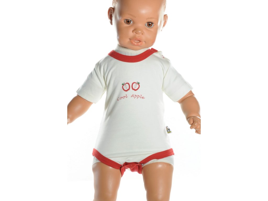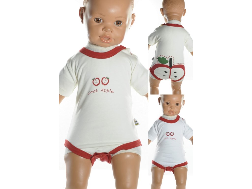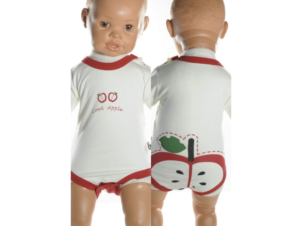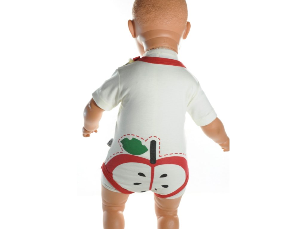 Detské, kojenecké body - červené jablko, krátky rukáv. Body je krémovej farby s obrázkom červeného jablka na zadnej strane a 2 malými jabĺčkami na prednej strane.
