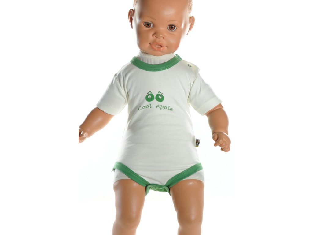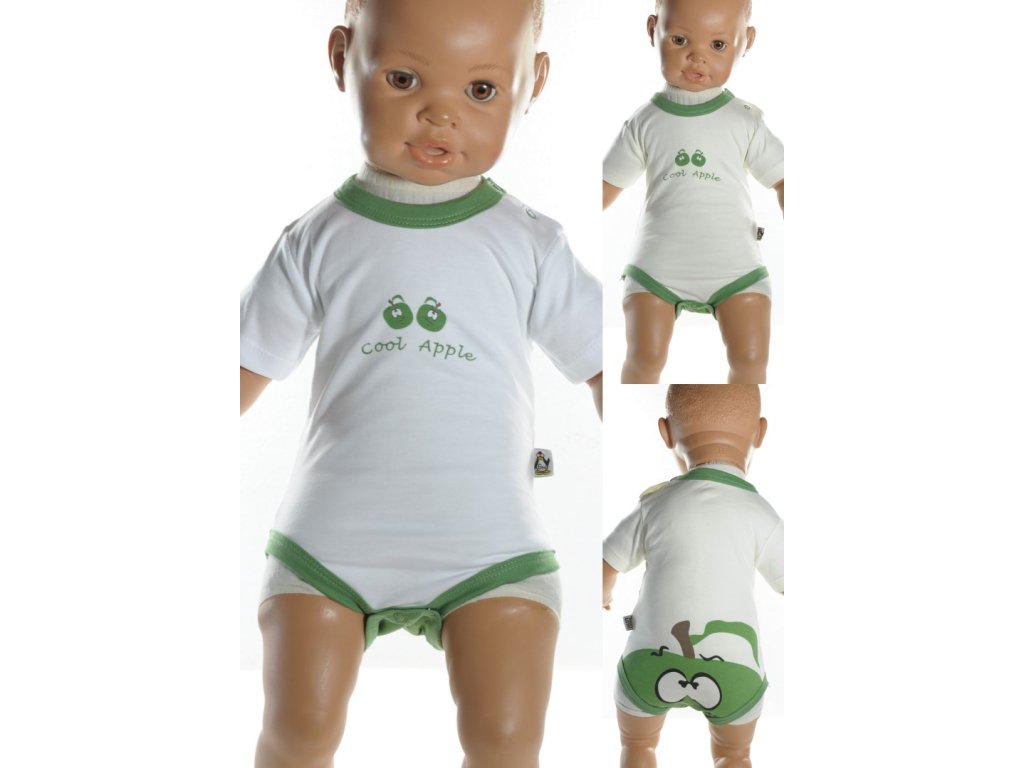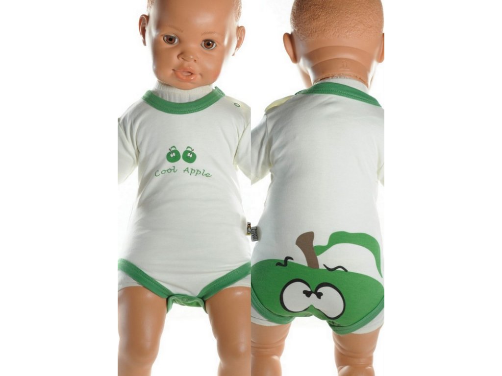 Detské, kojenecké body - zelené jablko, krátky rukáv. Body je krémovej farby s obrázkom zeleného jablka na zadnej strane a 2 malými jabĺčkami na prednej strane.