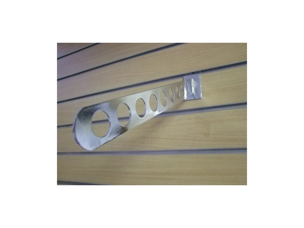 Kovový držiak do drážkového systému s guľatými otvormi na zavesenie vešiakov, či doplnkov ako šatky šále a pod.