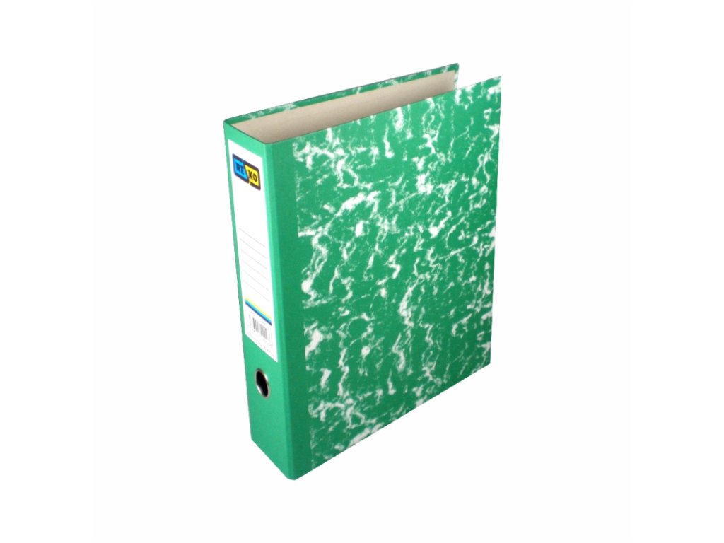 Materiál: tvrdý kartón potiahnutý potlačeným mramorovým papierom. Na chrbte je predtlačený nevymeniteľný štítok na označovanie obsahu zakladača.