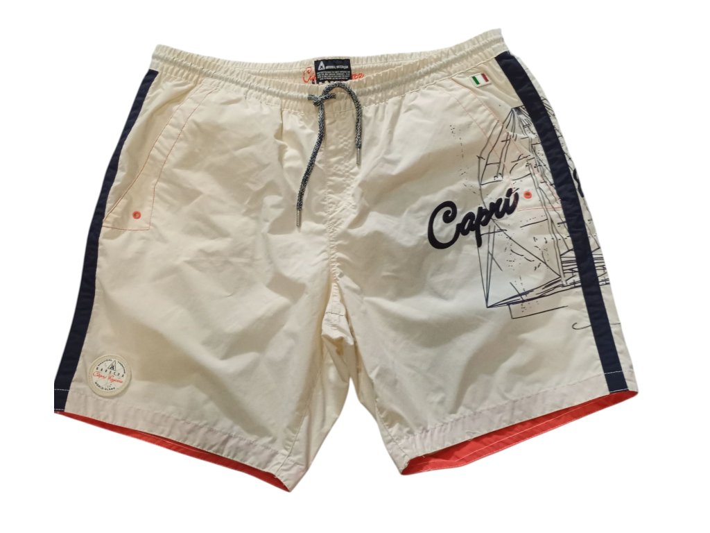 Plavky na uväzovanie s dvoma bočnými vreckami,jedným zadným vreckom na suchý zips a jedným skrytým vnútorným malým vreckom.