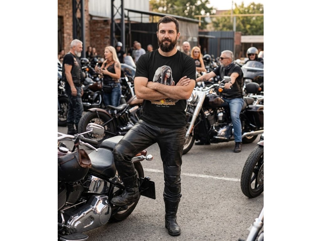 Vyjadrite svoju nespútanú dušu s týmto exkluzívnym motorkárskym tričkom. Dominantný motív indiánky s nápadnou čelenkou, ktorá hrdo pózuje pri klasickom motocykli, symbolizuje slobodu a silu, ktorú zažívate len na cestách. Toto tričko nie je len oblečenie, je to postoj.